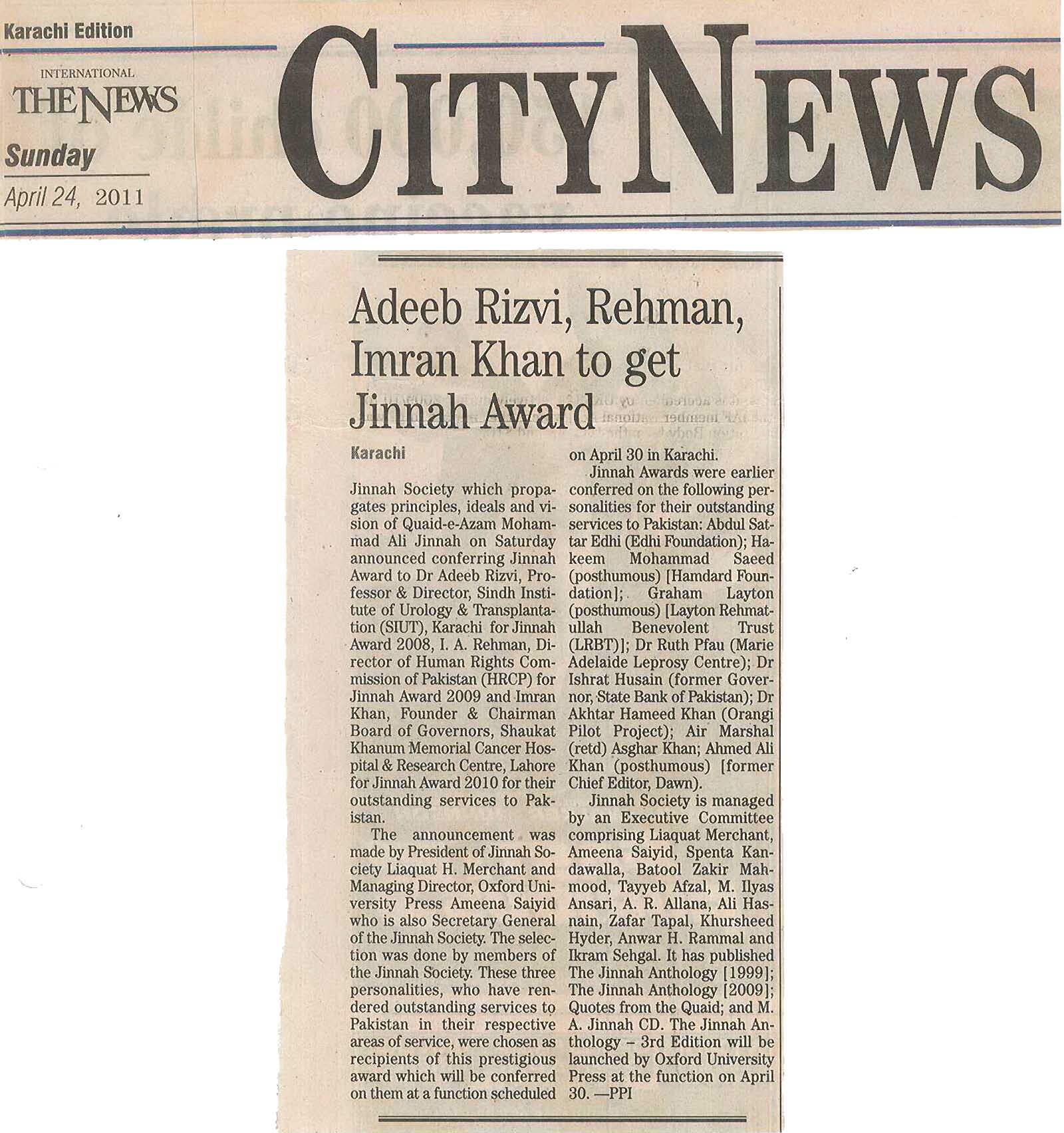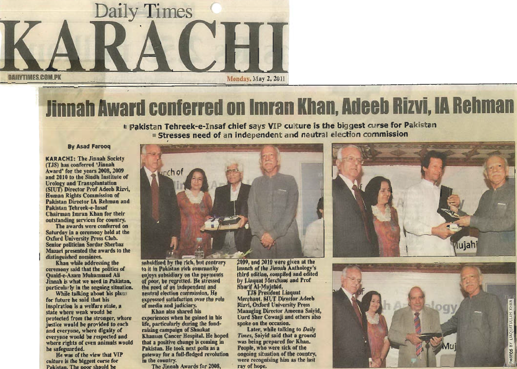 Members of the Jinnah Society selected Dr. Adib Rizvi, Professor and Director, Sindh Institute of Urology and Transplantation (SIUT) as their nominee for the Jinnah Award 2008, Mr. Ibn Adur Rahman, more familiar as I. A. Rahman, Director of the Human Rights Commission of Pakistan (HRCP) for the Jinnah Award 2009 and Mr Imran Khan, Founder and Chairman, Board of Governors, Shaukat Khanum Memorial Cancer Hospital and Research Centre for the Jinnah Award 2010. These three persons were honoured for their outstanding services to Pakistan in their respective areas of service. The awards were conferred on them by Sardar Sherbaz Khan Mazari at a ceremony held and hosted by Oxford University Press (Pakistan) on 30th April 2011 at Karachi. Mr. Liaquat Merchant and Mr. Imran Khan addressed the large audience present at the ceremony.