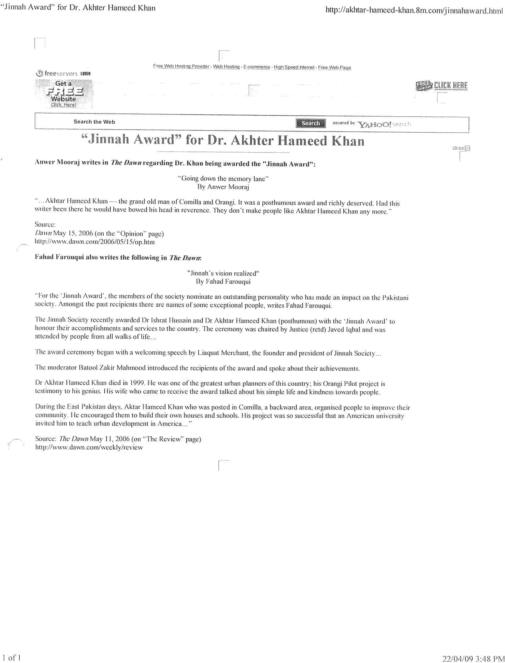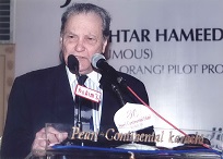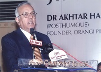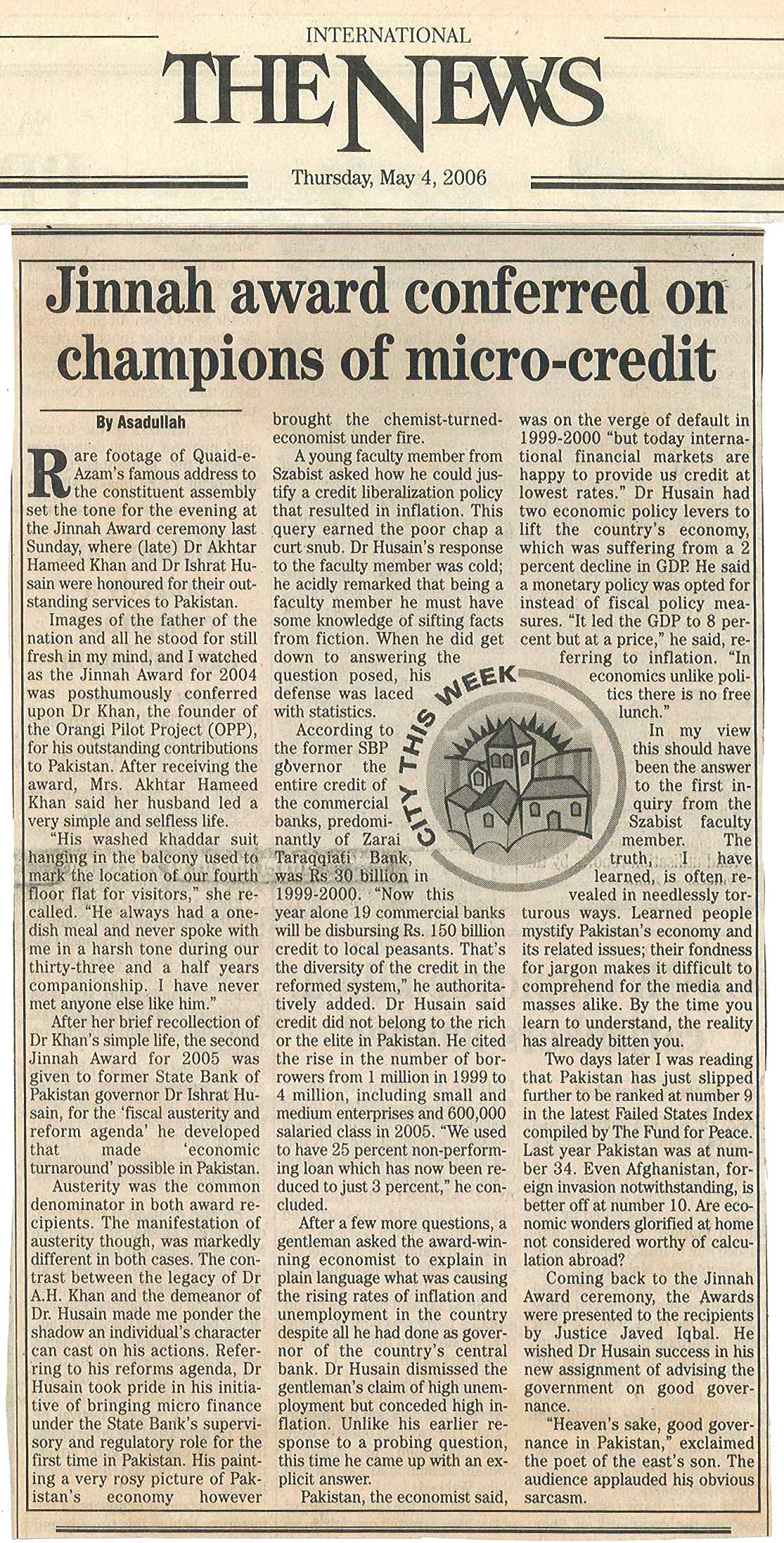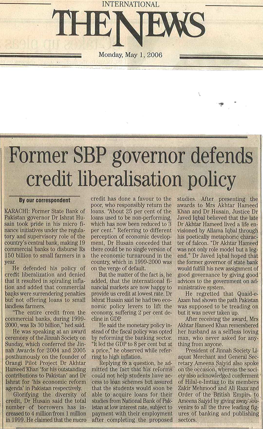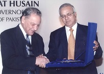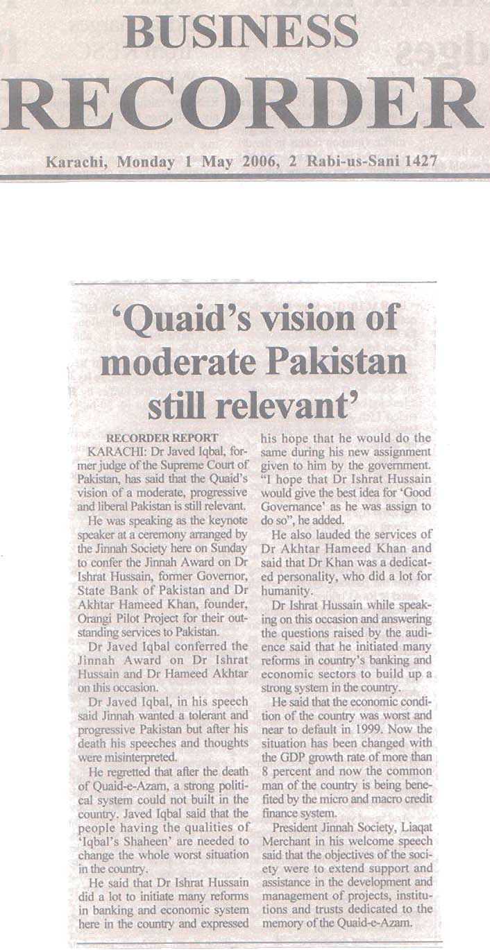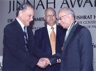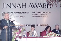 The recipients of the fifth and sixth Jinnah Awards selected by Members of the Jinnah Society were Dr. Akhter Hameed Khan to whom the award was conferred posthumously for his outstanding and dedicated services to the people of Pakistan in the shape of Orangi Pilot Project. The award was received by his widow Mrs. Shafiq Khan. The other recipients of the award was Dr. Ishrat Hussain a former Governor of State Bank of Pakistan for his vision and services in regulating banking policy which resulted in domestic growth. The Function was held on 28th April 2006 at Pearl-Continental Hotel and was very largely attended by elite of the city. As usual, an inter-active discussion took place between the audience which included students and Dr. Javid Iqbal who was the Chief Guest as well as Dr. Ishrat Hussain. Two Members of the Jinnah Society Syed Ali Raza and Zakir Mehmood had earlier received the civil award of Sitara-e-Imtiaz while another member Ameena Saiyid was conferred the award of OBE by Queen Elizabeth. These three members were awarded special plaques by the Jinnah Society in recognition of their achievements.