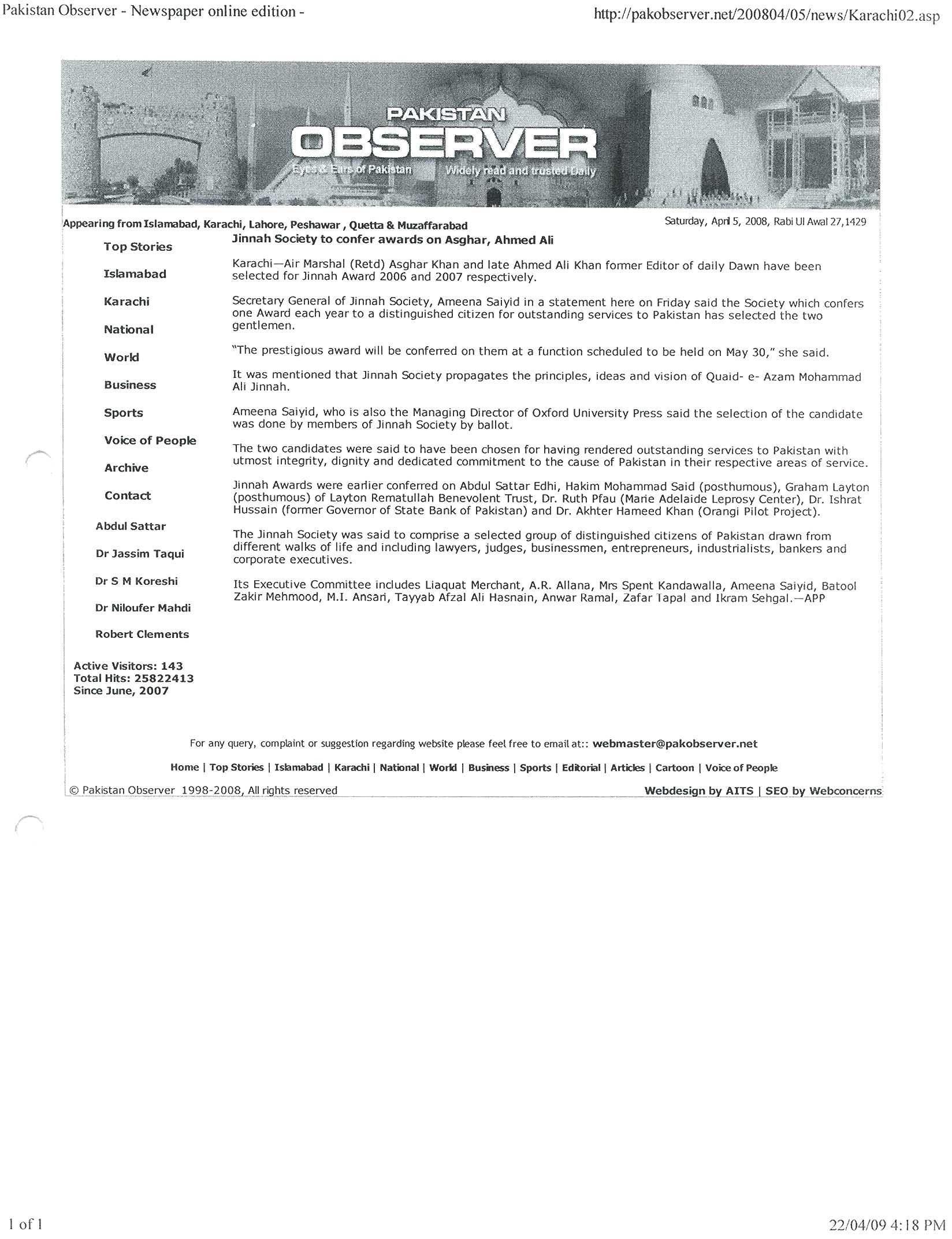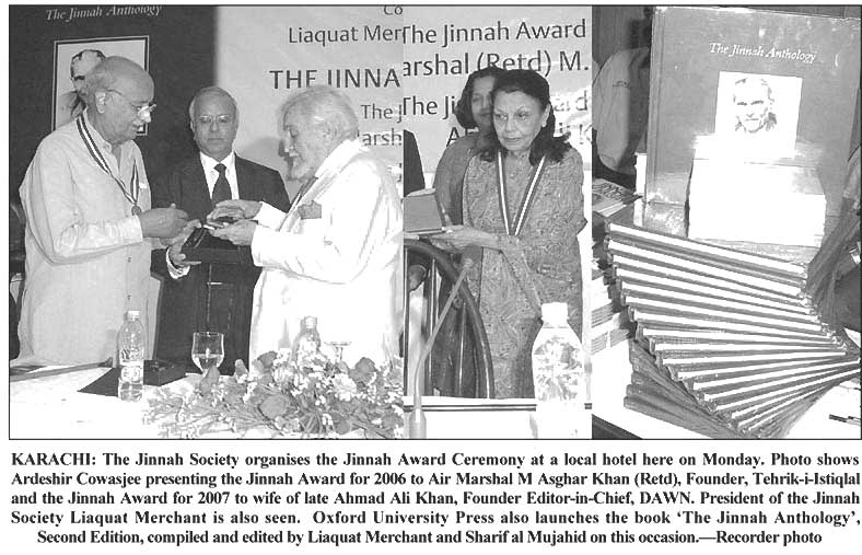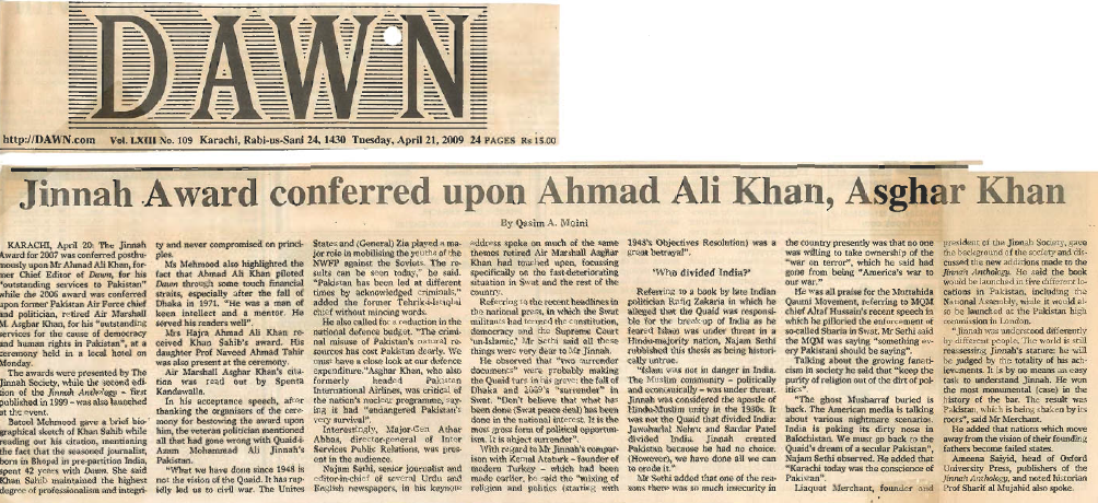 Former Air Force Chief and politician, retired Air Marshal Asghar Khan and former Chief Editor - Dawn late Ahmed Ali Khan were selected by the by the Members of the Jinnah Society for the Jinnah Award 2006 and 2007, respectively. At a function which was held at Beach Luxury Hotel, Karachi in April 2009 and very largely attended by the elite of the city, the Jinnah Award 2006 was conferred upon Air Marshal (Retd.) Asghar Khan for his outstanding and dedicated services to the cause of democracy and human rights in Pakistan while the Jinnah Award 2007 was conferred posthumously on Mr. Ahmad Ali Khan for his outstanding services in the field of Journalism. The Award for late Ahmad Ali Khan was received by his widow. Mr. Najam Sethi was the Guest Speaker at this function.