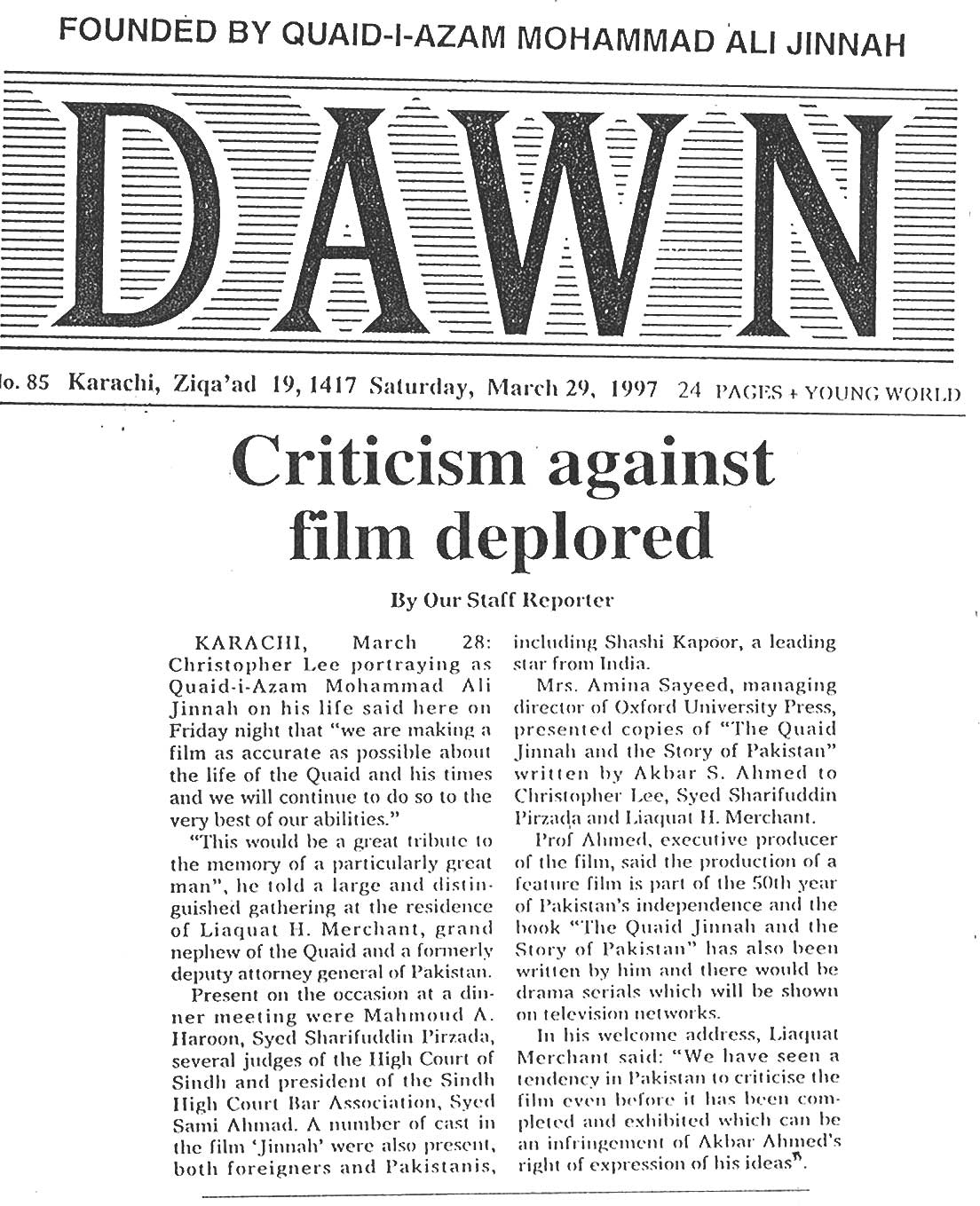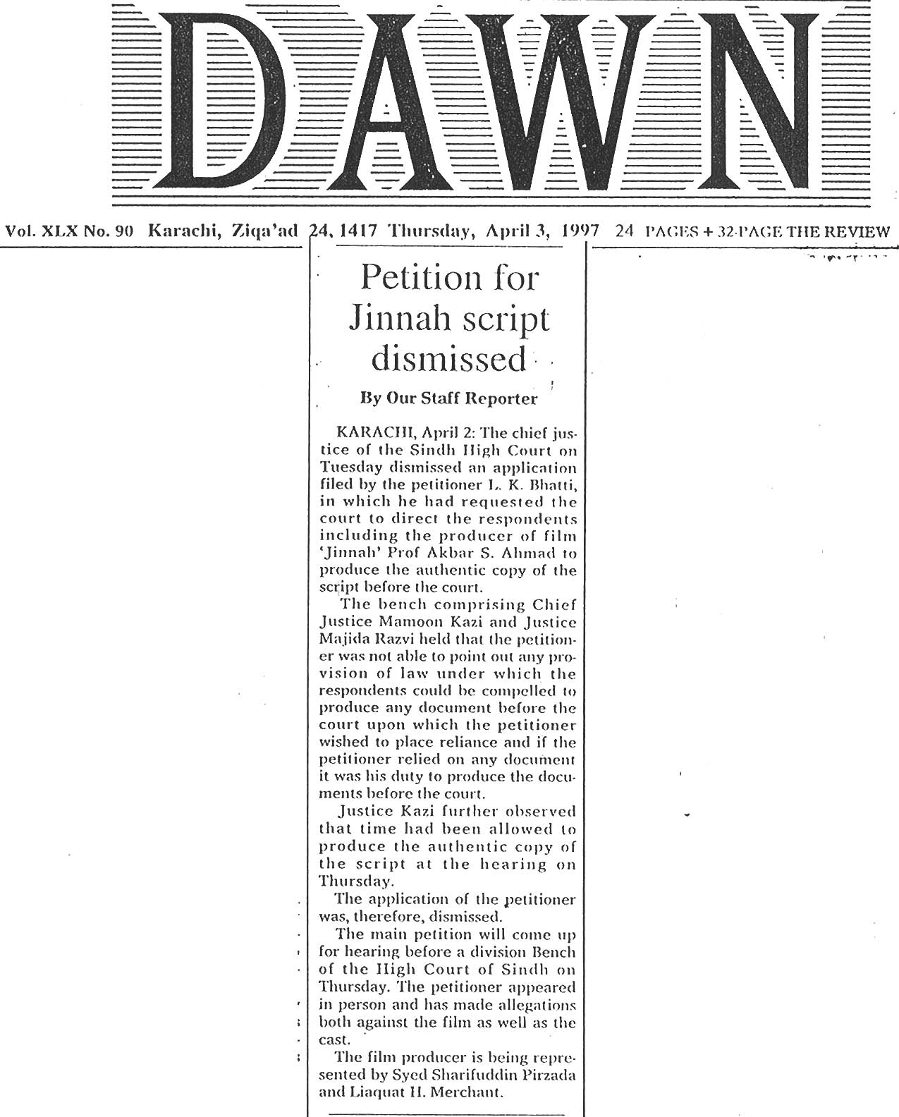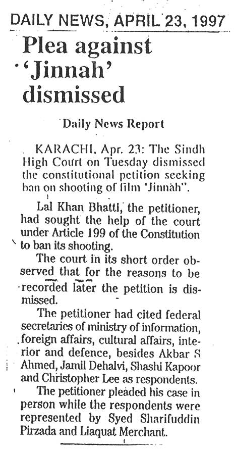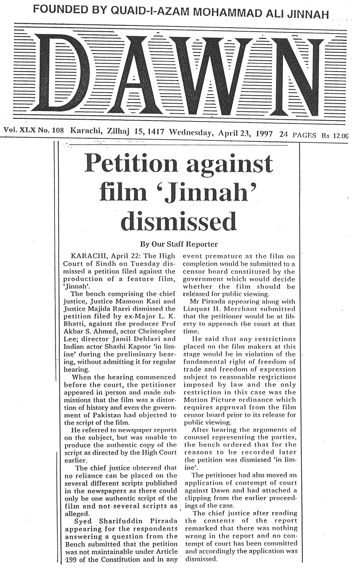 A constitutional petition filed in the High Court of Sindh at Karachi against the Producer, Director and cast of the film ‘Jinnah’ was successfully defended by S. Sharifuddin Pirzada and Liaquat Merchant. The High Court upheld that a film was an expression of thought and ideas and was protected on the same basis as freedom of speech and expression, a fundamental right guaranteed under the Constitution of Pakistan. The petition was dismissed and the film went on to completion.