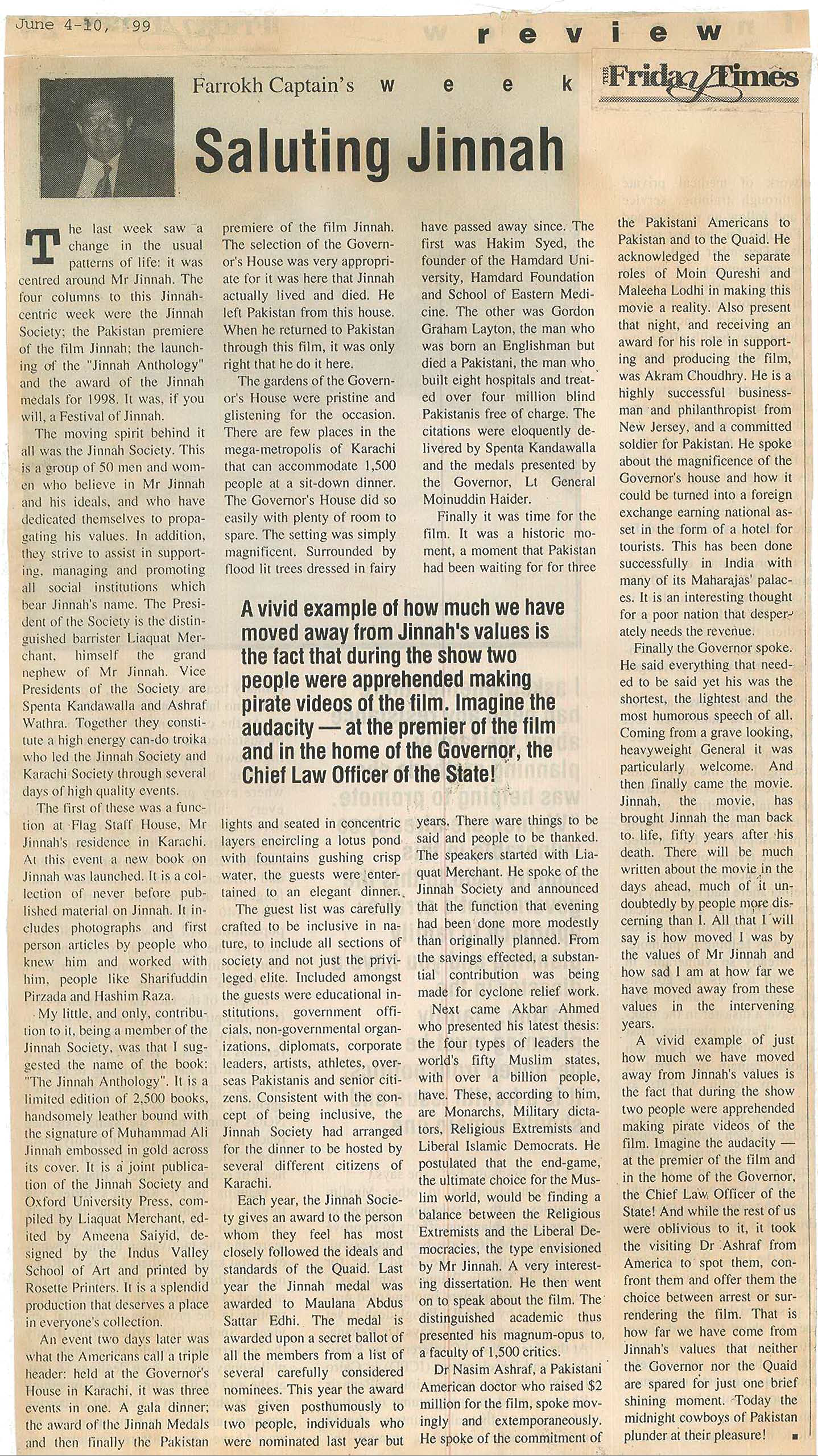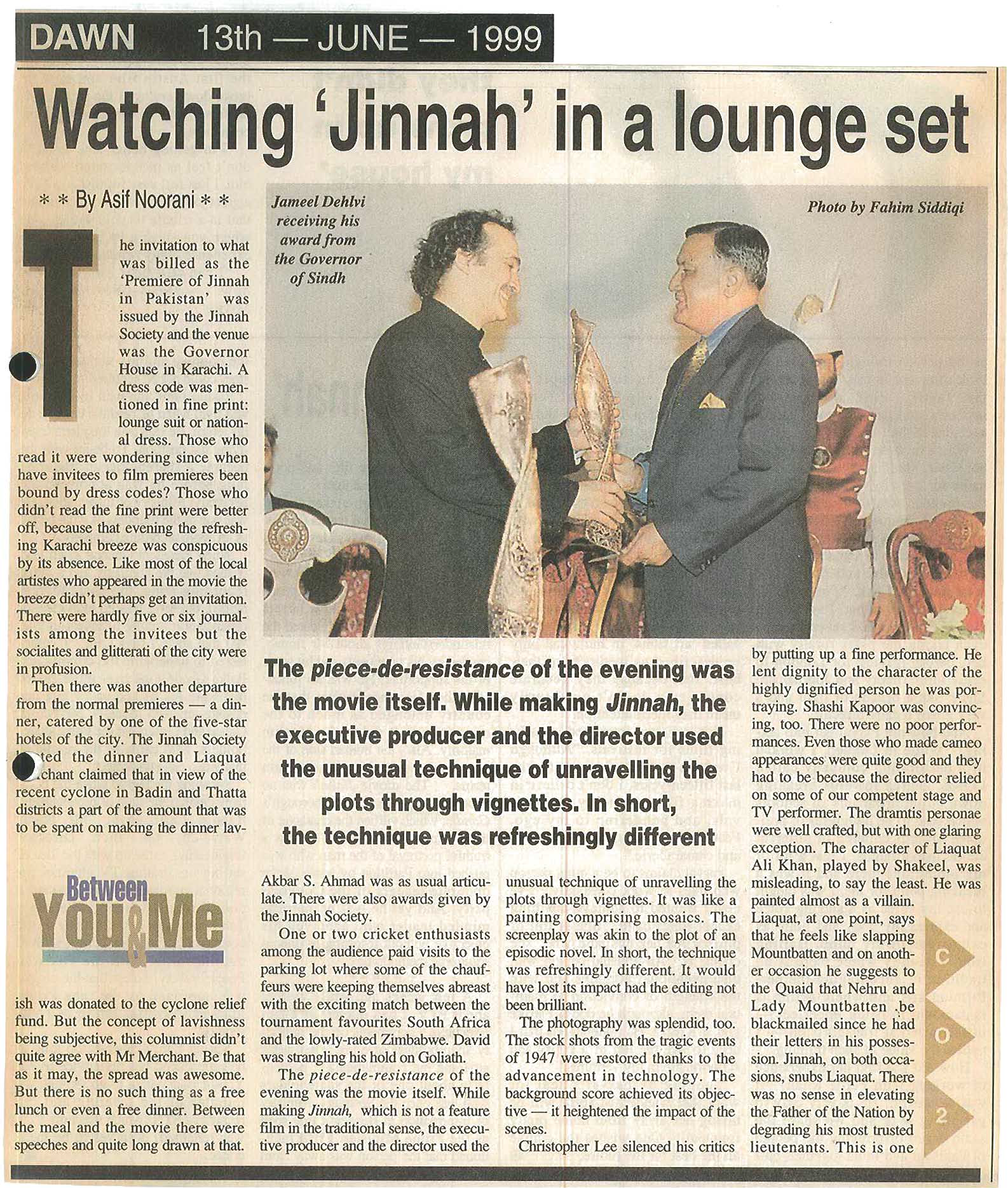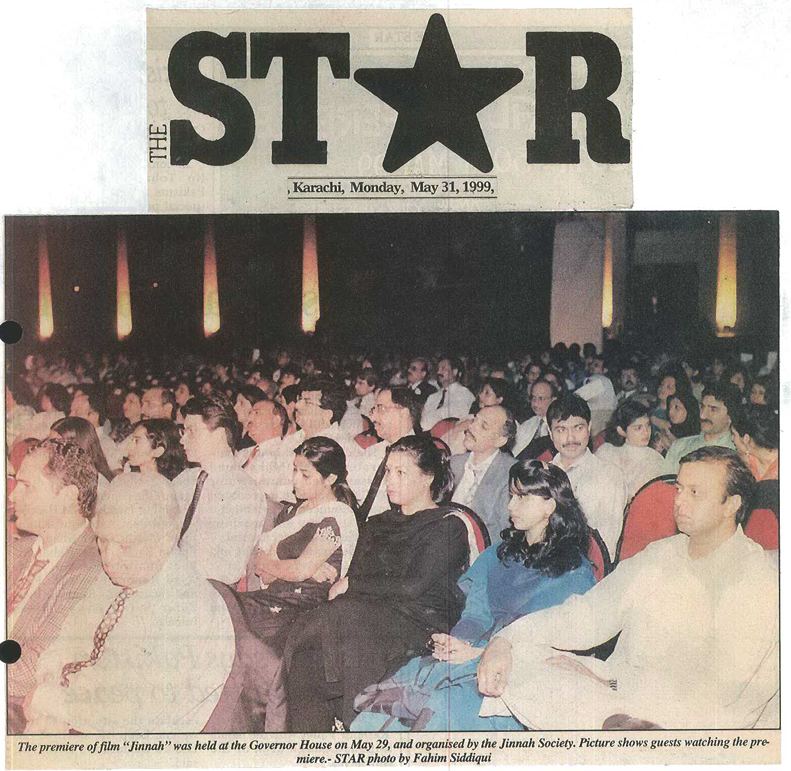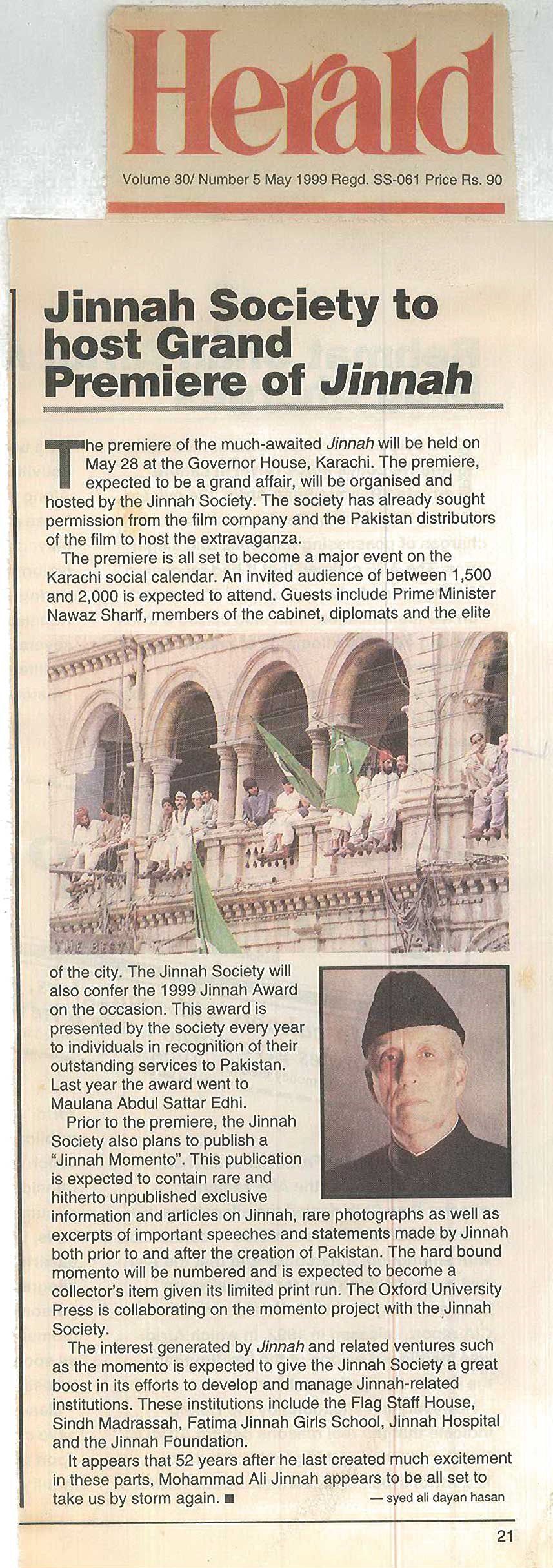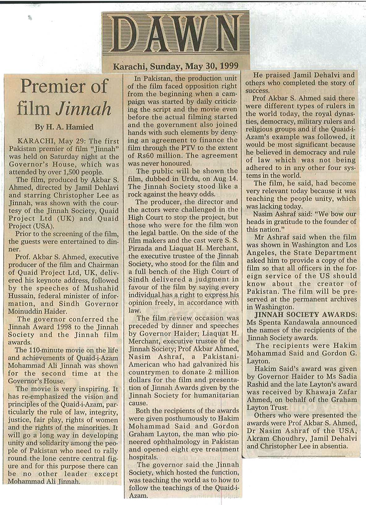 Following the launch of the Jinnah film project, functions were arranged by the Jinnah Society for the purpose of securing financial support to the film project. The legal hurdle was overcome and the film project though in financial crisis went on to completion with the assistance arranged by a group of Pakistani physicians in the US led to Dr. Nasim Ashraf. A grand premiere was organized and held by the Jinnah Society at the Governor House, Karachi in May 1999 which was attended by more than 2500 guests who were invited by the Society and the Governor of Sindh. Awards were given to Professor Akbar Ahmad, Jameel Dehlavi, Dr. Nasim Ashraf and others. The film hit the headlines in Pakistan’s newspapers.