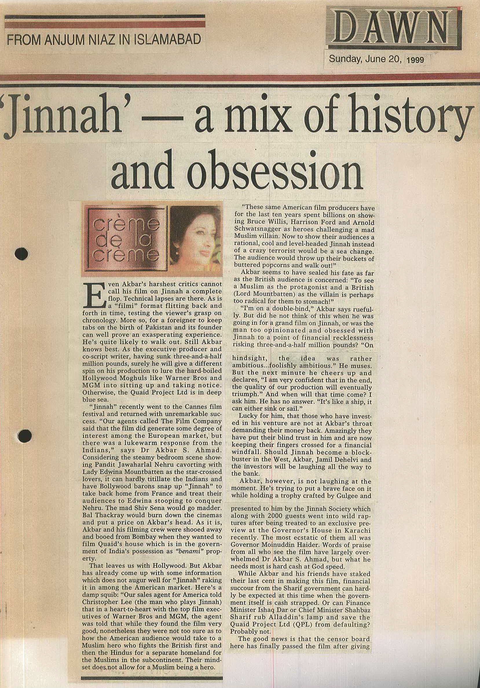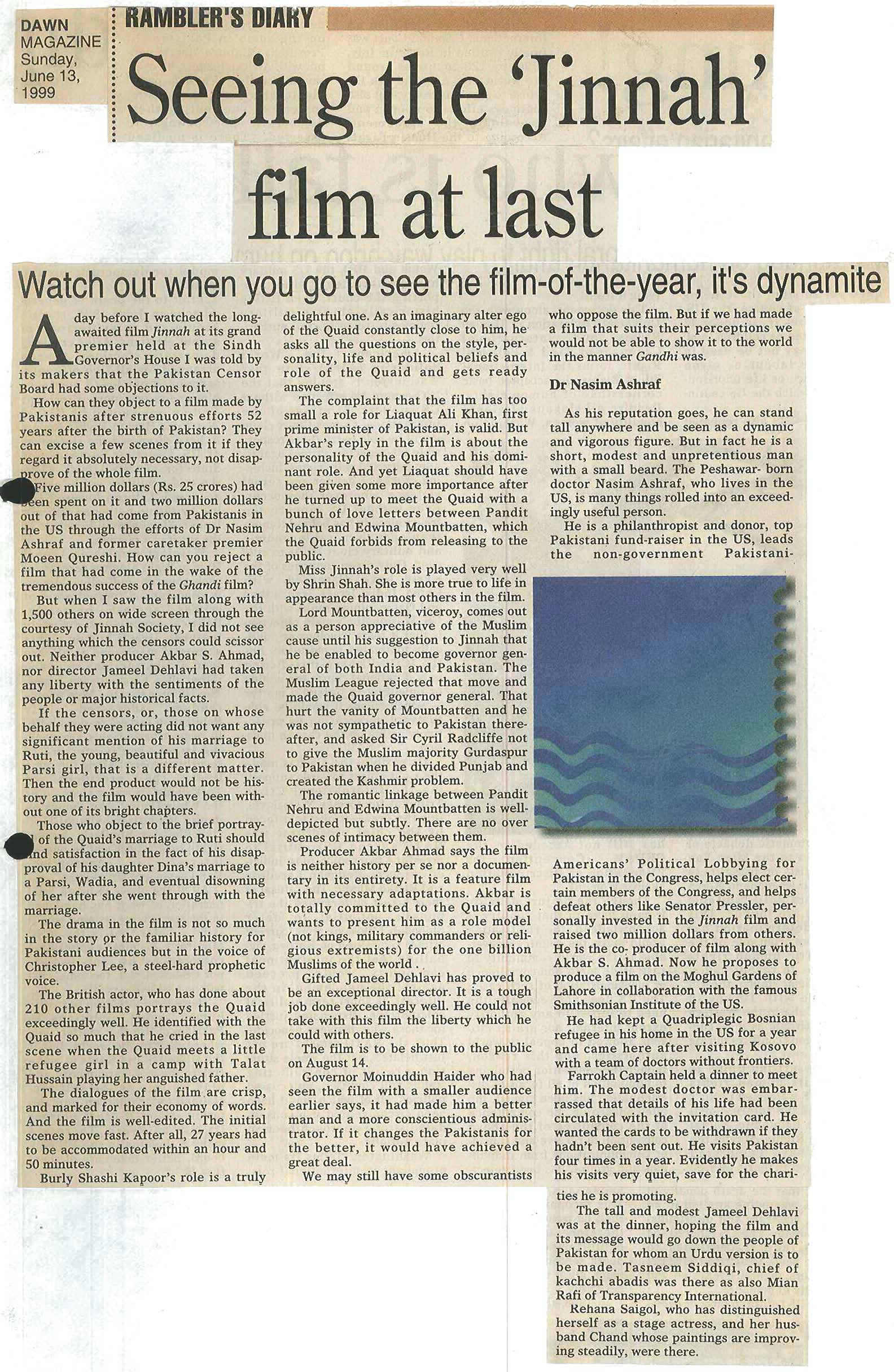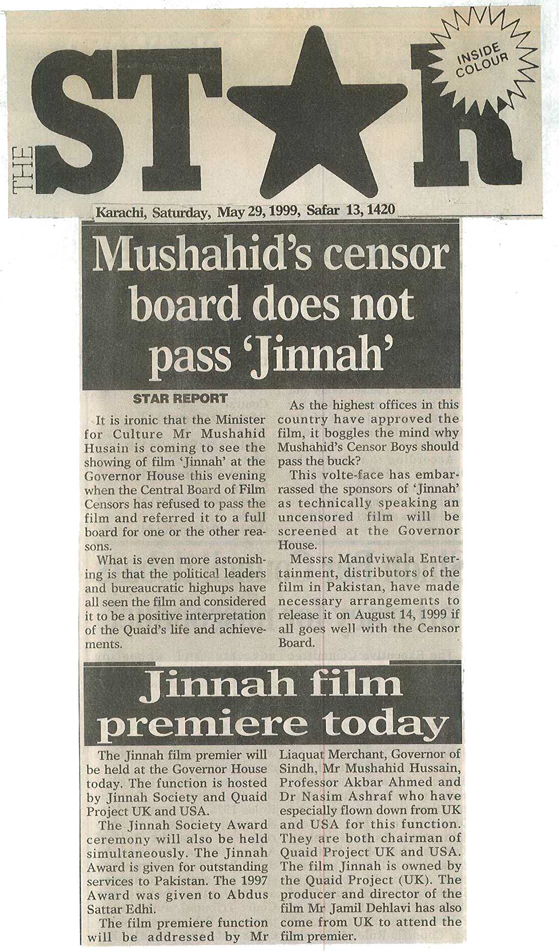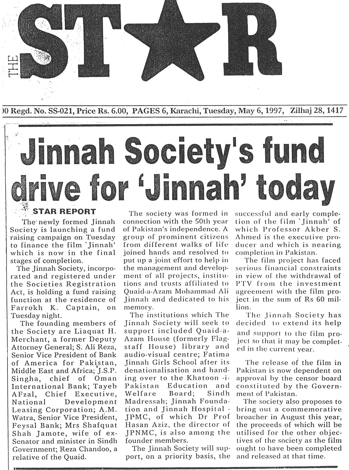 Following the launch of the Jinnah film project, functions were arranged by the Jinnah Society for the purpose of securing financial support to the film project. The legal hurdle was overcome and the film project though in financial crisis went on to completion with the assistance arranged by a group of Pakistani physicians in the US led to Dr. Nasim Ashraf. A grand premiere was organized and held by the Jinnah Society at the Governor House, Karachi in May 1999 which was attended by more than 2500 guests who were invited by the Society and the Governor of Sindh. Awards were given to Professor Akbar Ahmad, Jameel Dehlavi, Dr. Nasim Ashraf and others. The film hit the headlines in Pakistan’s newspapers.