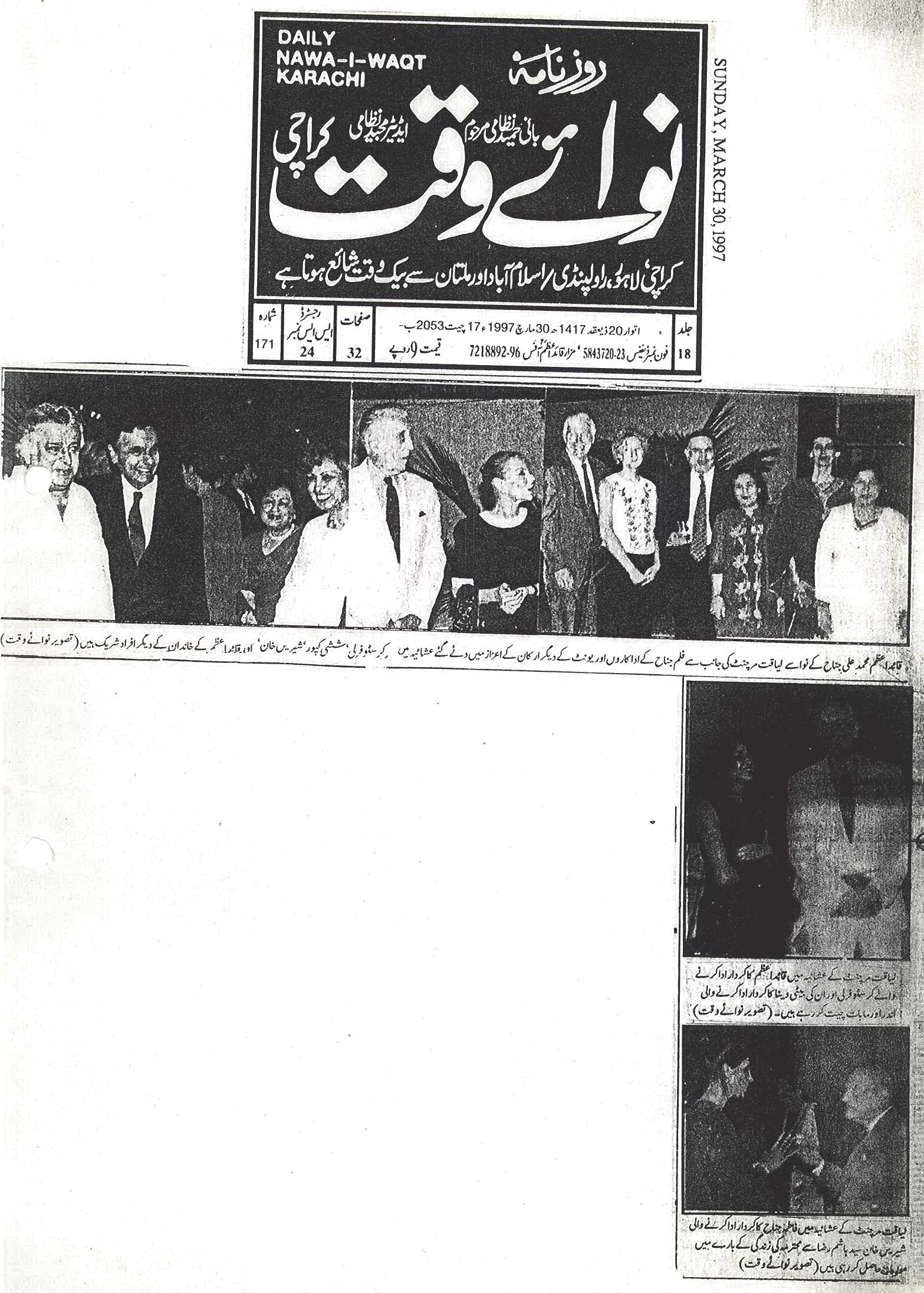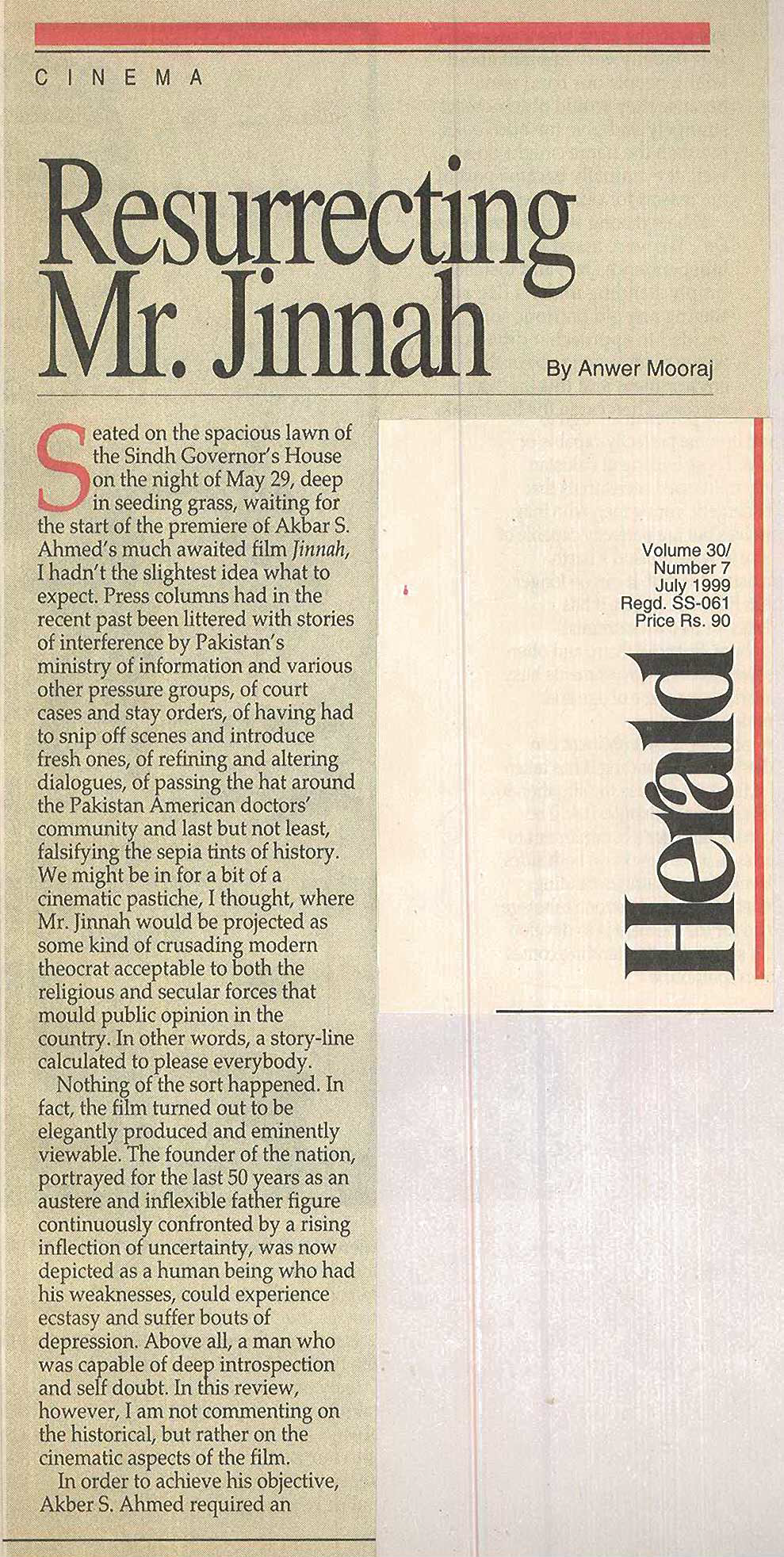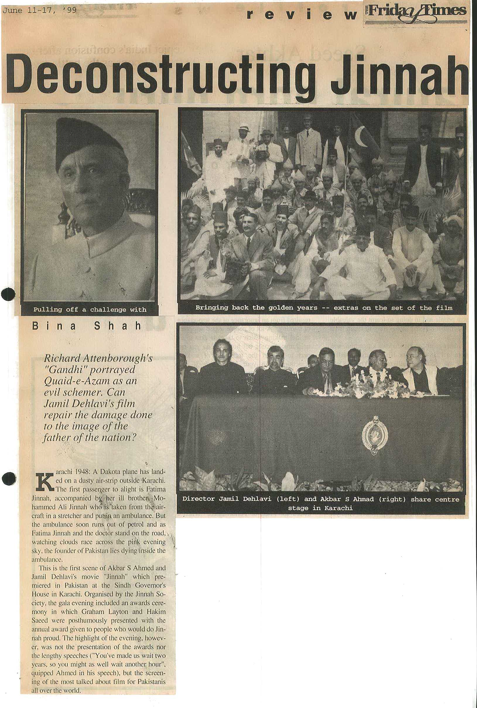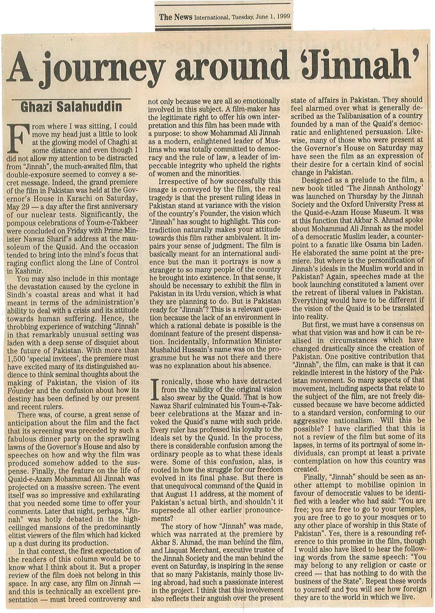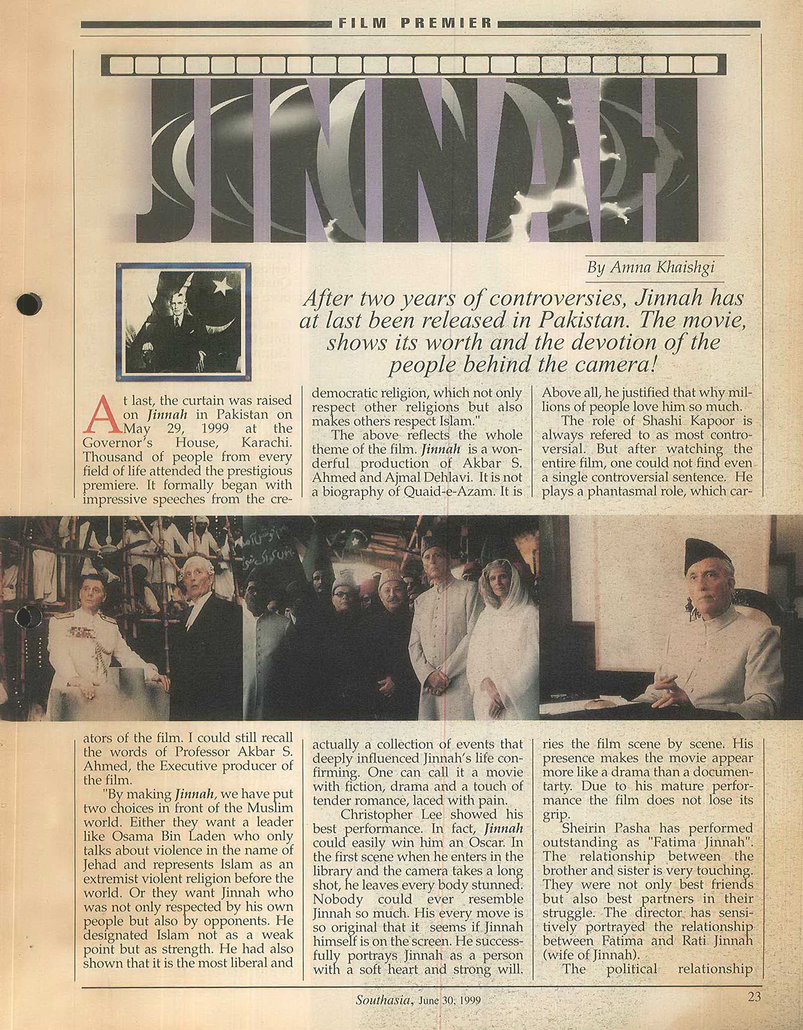Following the launch of the Jinnah film project, functions were arranged by the Jinnah Society for the purpose of securing financial support to the film project. The legal hurdle was overcome and the film project though in financial crisis went on to completion with the assistance arranged by a group of Pakistani physicians in the US led to Dr. Nasim Ashraf. A grand premiere was organized and held by the Jinnah Society at the Governor House, Karachi in May 1999 which was attended by more than 2500 guests who were invited by the Society and the Governor of Sindh. Awards were given to Professor Akbar Ahmad, Jameel Dehlavi, Dr. Nasim Ashraf and others. The film hit the headlines in Pakistan’s newspapers.