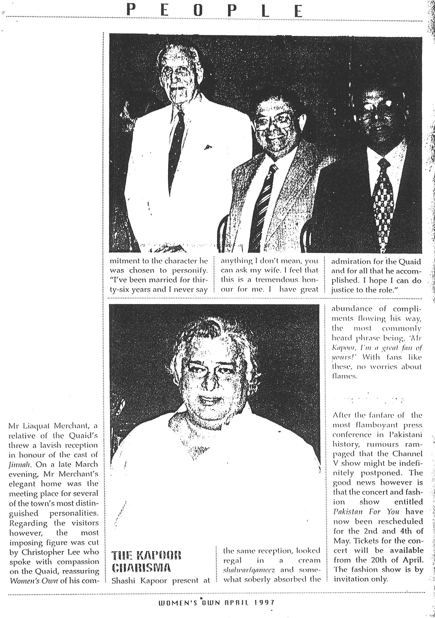 The Jinnah Film Project ran into financial difficulties during the period 1997 – 1999 and it was at this juncture that a decision was taken to establish The Jinnah Society. The inaugural function as well as a fund raising event was organized by The Jinnah Society at the residence of Mr. Farrokh K. Captain which was attended by Professor Akbar Ahmad as well as Shashi Kapoor and several other events were similarly organized in support of the Jinnah Film Project which ultimately led to its completion in Pakistan in spite of PTV withdrawing its offer of financial support.