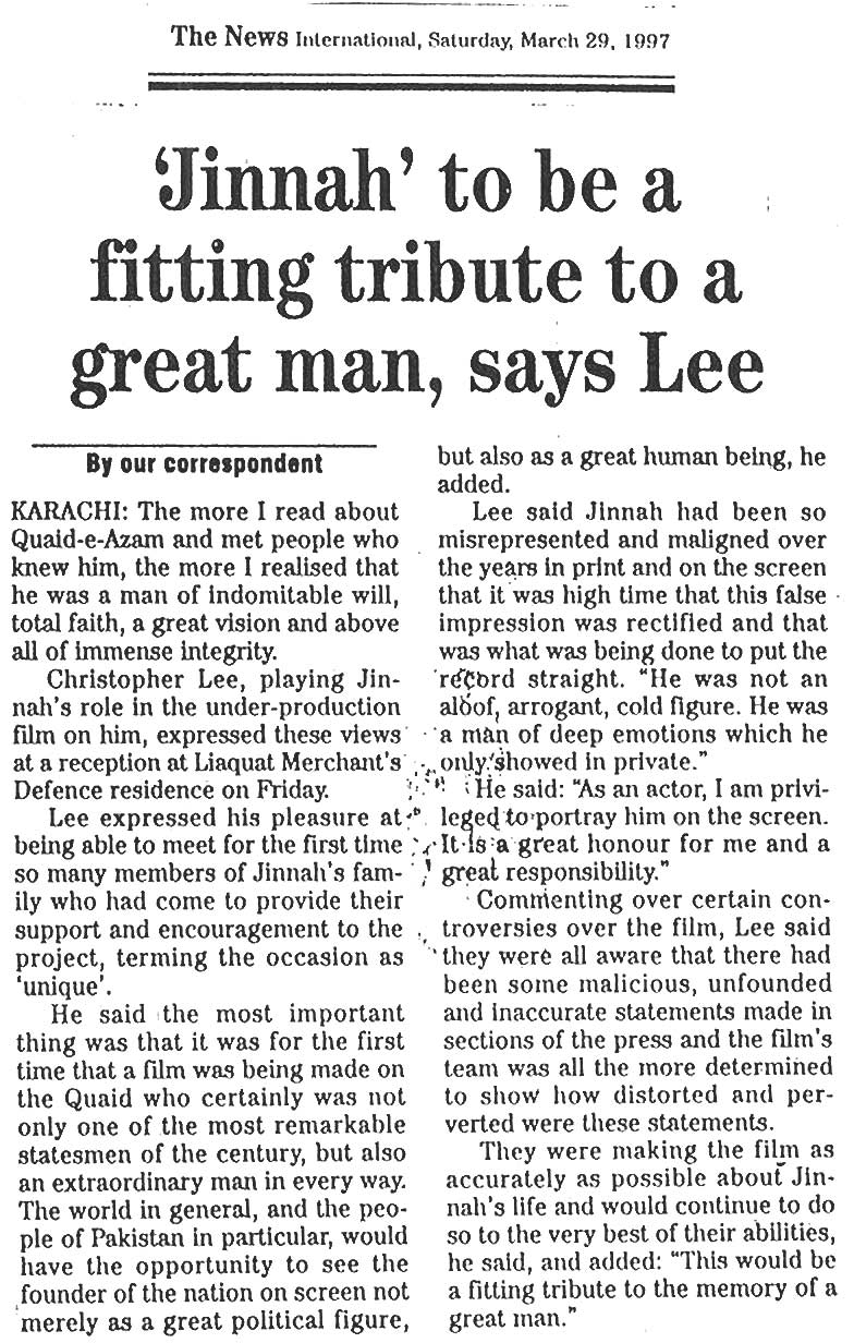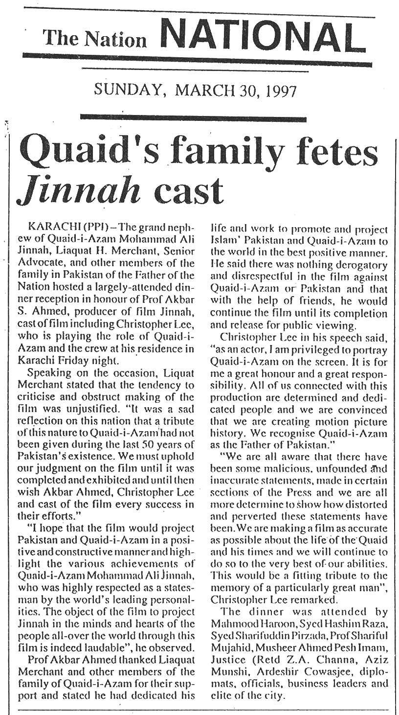 The Jinnah Film Project was launched at a function held at the residence of the President of Jinnah Society in 1997 at which the entire cast and crew of the film were present including Mr Christopher Lee who played the role of Jinnah as well as the other cast who played the role of Jawaharlal Nehru, Prime Minister of India, Lord Mountbatten, Lady Mountbatten, Fatima Jinnah and Ruttie Jinnah. Like the real Jinnah, Christopher who played the role of Mr. Jinnah spoke at the function and said: