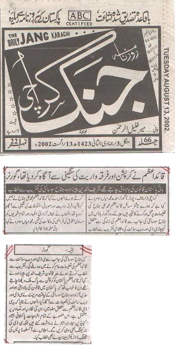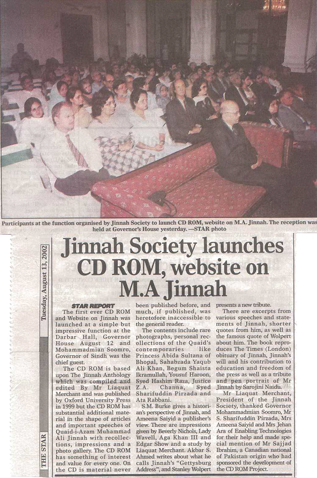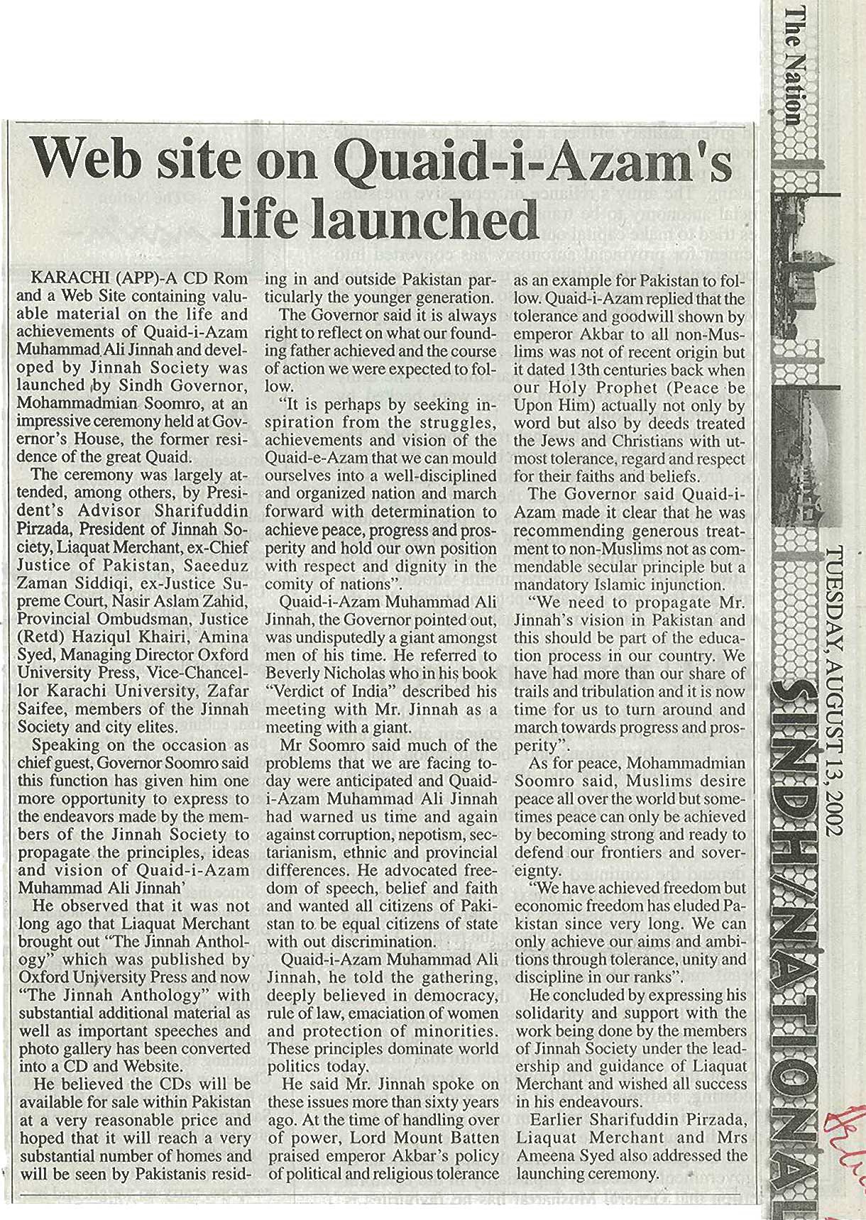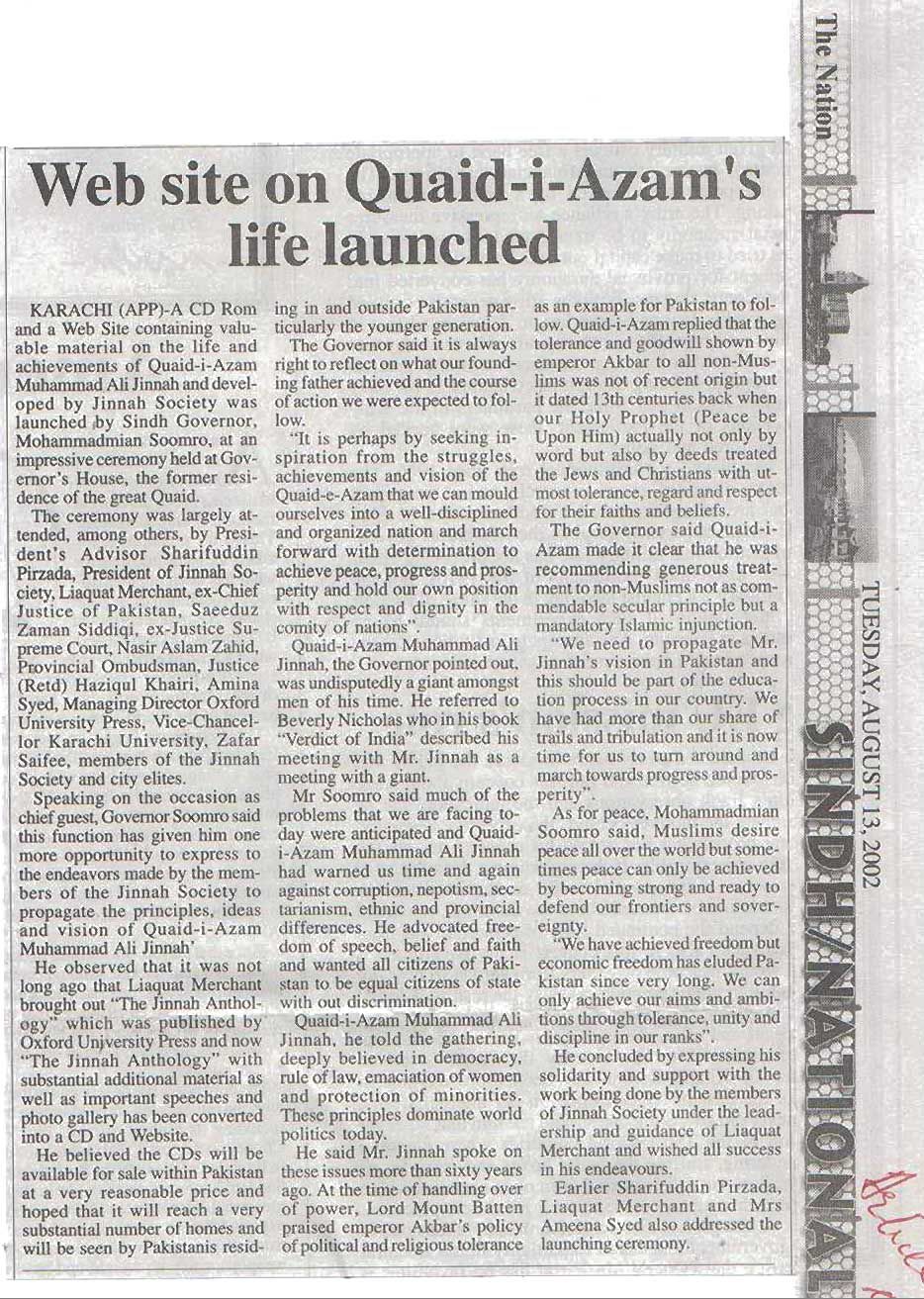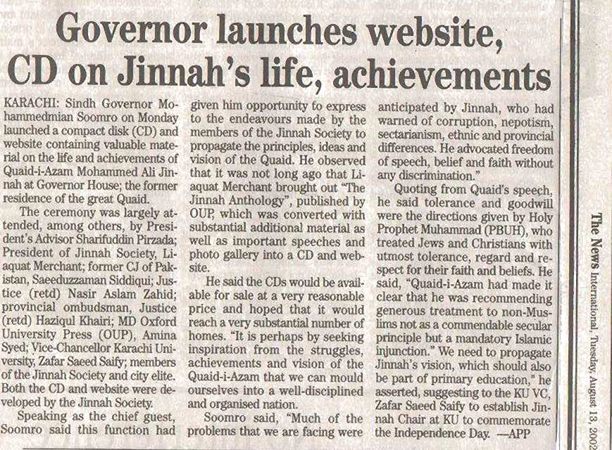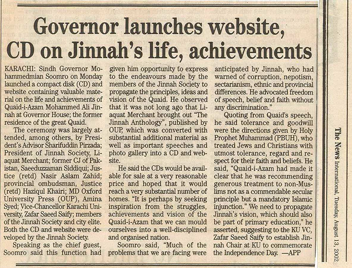 The Jinnah Society established a M.A. Jinnah CD ROM Project and Website in August 2002. The M.A. Jinnah CD, which was compiled and edited by Mr. Liaquat Merchant, President of The Jinnah Society was launched at a function at the Governor House, Karachi in August 2002. The CD’s are now on sale both within and outside Pakistan. The Website ‘www.majinnah.com.pk’ is being redeveloping and shall be online shortly.