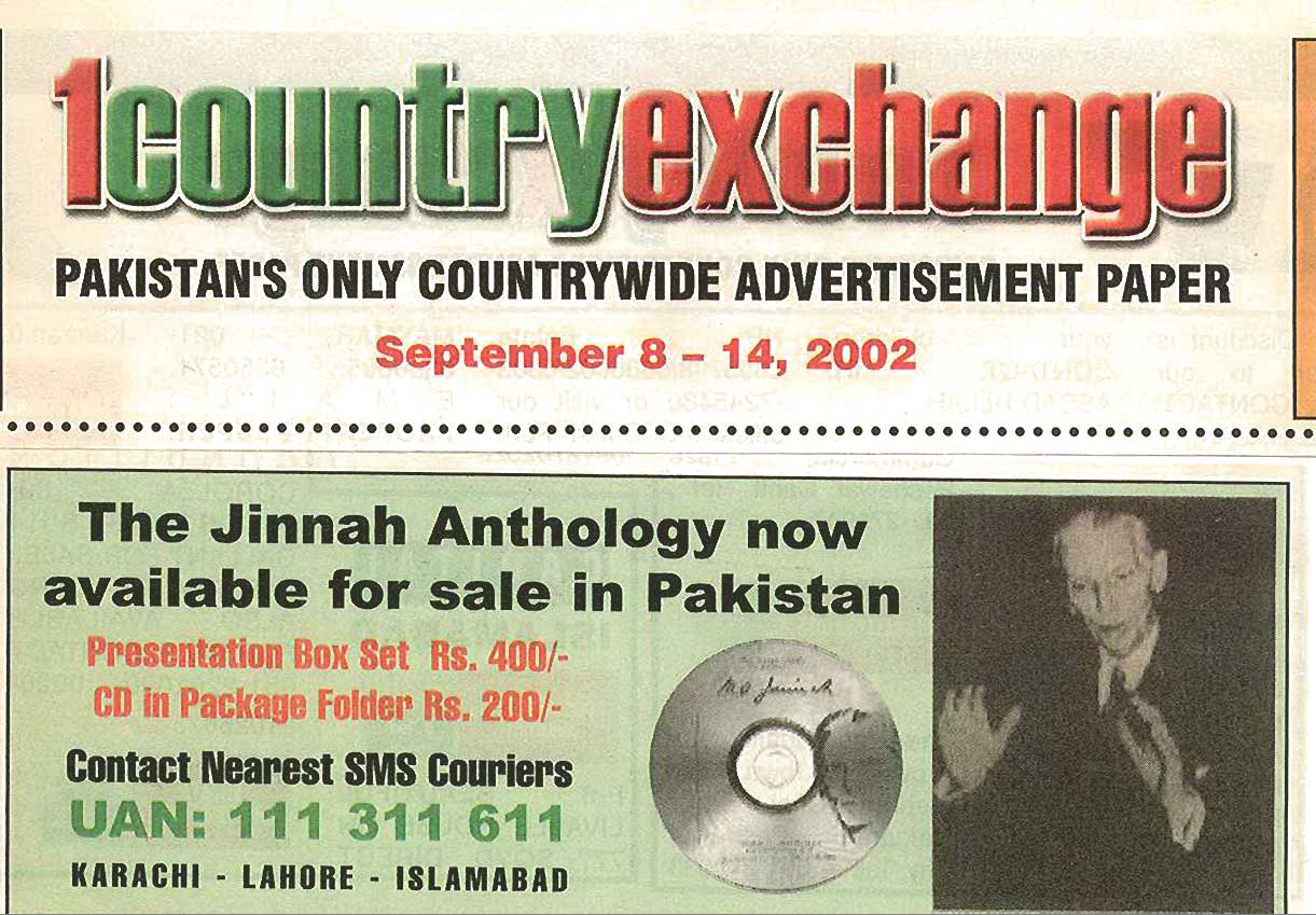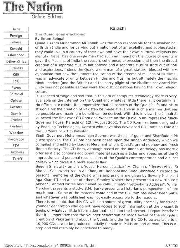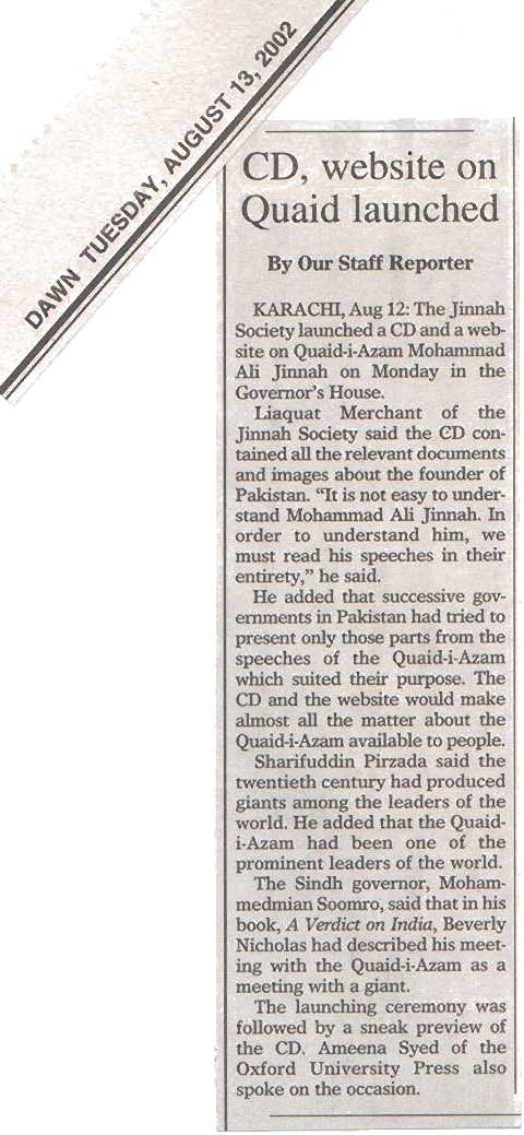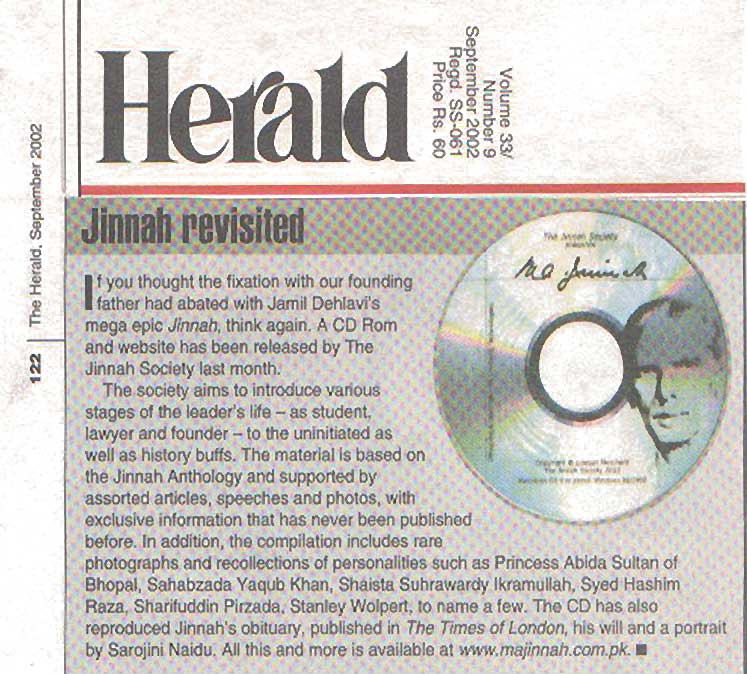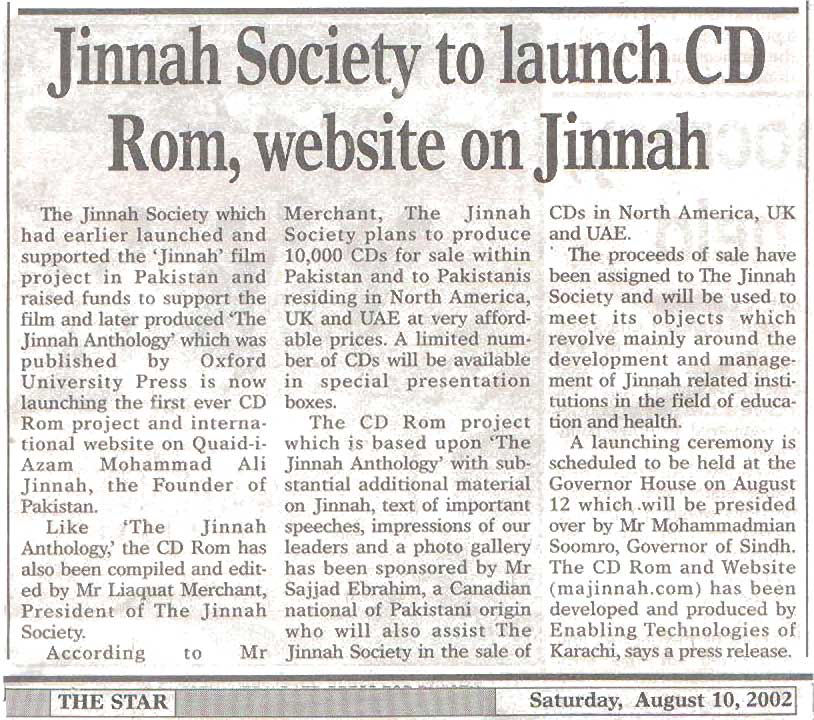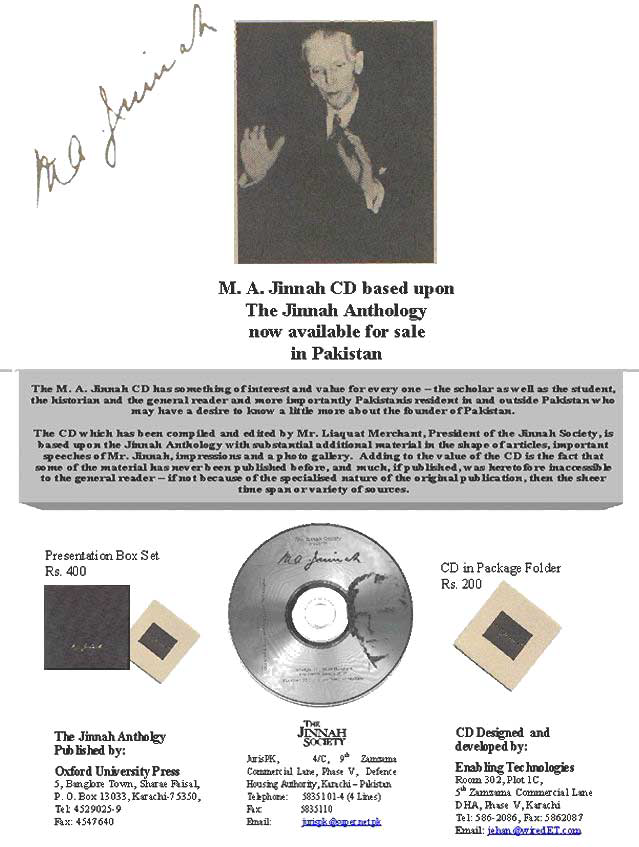 The M.A. Jinnah CD is structured around the Jinnah Anthology but with substantial more material on Mr. Jinnah including important speeches, articles and photographs. The CD is available for Rs.200 in Pakistan. The intention is to have a wide circulation among the younger generation both within and outside Pakistan.