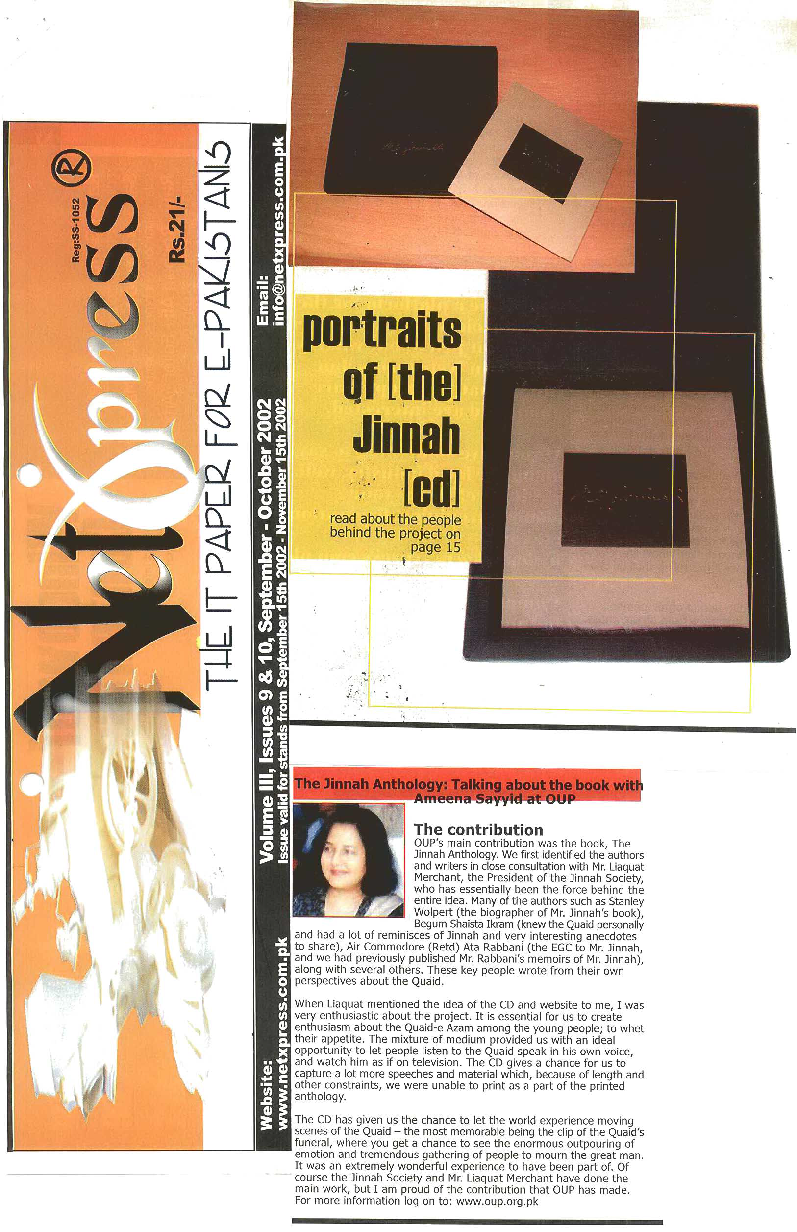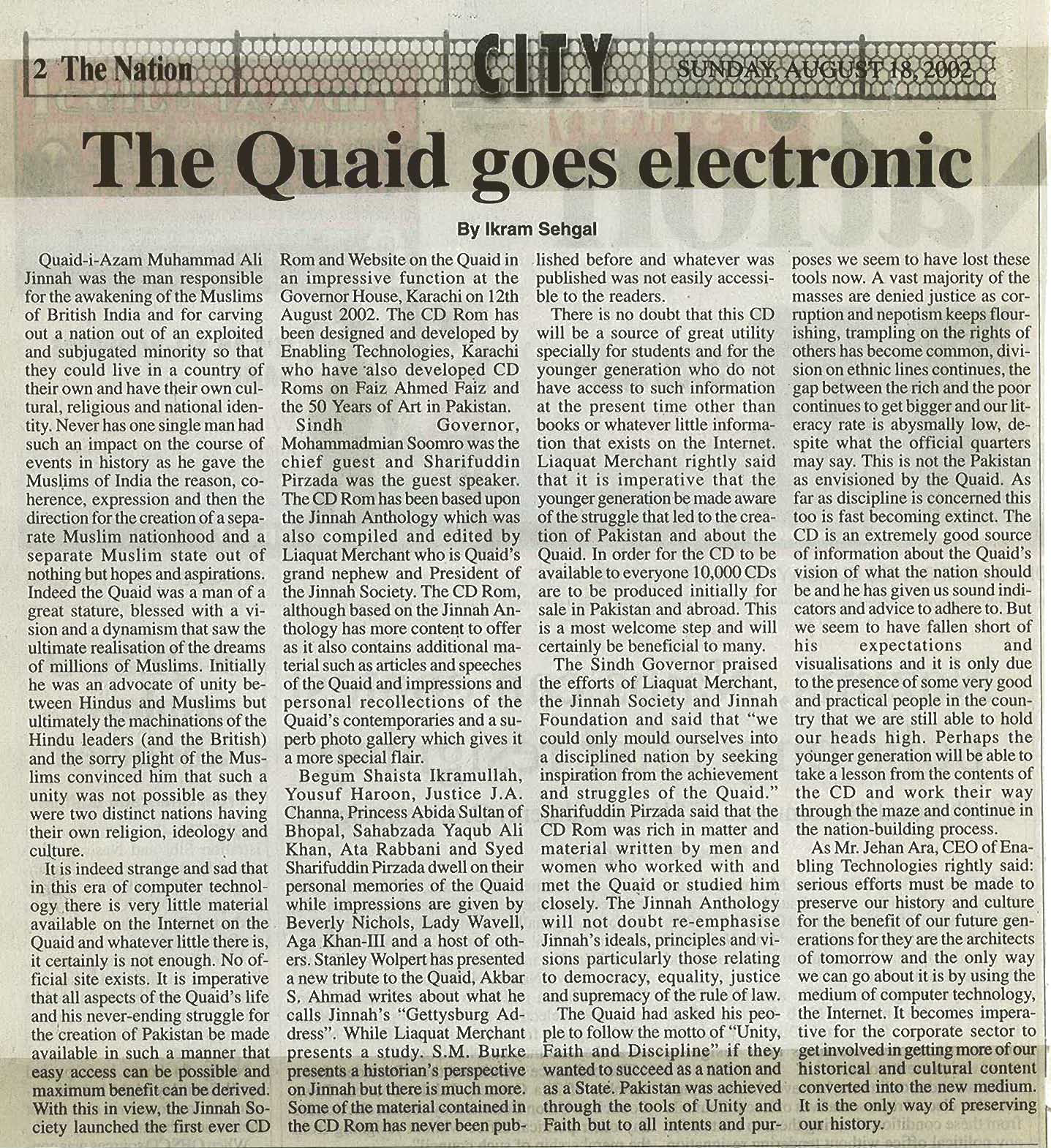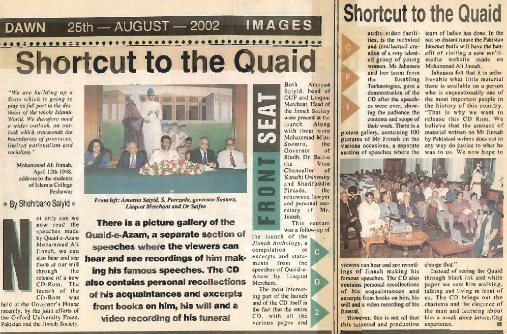 The M.A. Jinnah CD is structured around the Jinnah Anthology but with substantial more material on Mr. Jinnah including important speeches, articles and photographs. The CD is available for Rs.200 in Pakistan. The intention is to have a wide circulation among the younger generation both within and outside Pakistan.