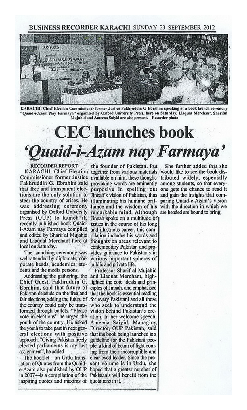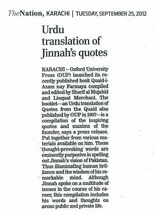 The book 'Quaid-i-Azam Nay Farmaya' is the urdu translation of 'Quotes from the Quaid' which was launched at Karachi on 2nd September 2012.